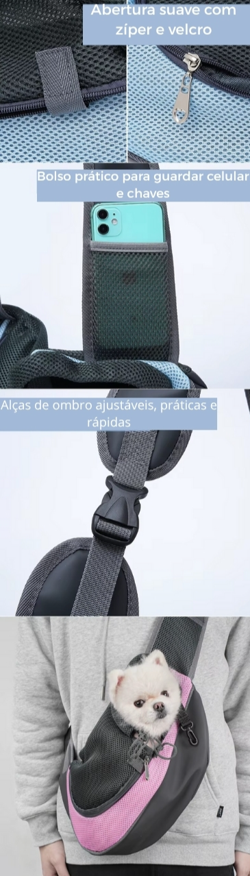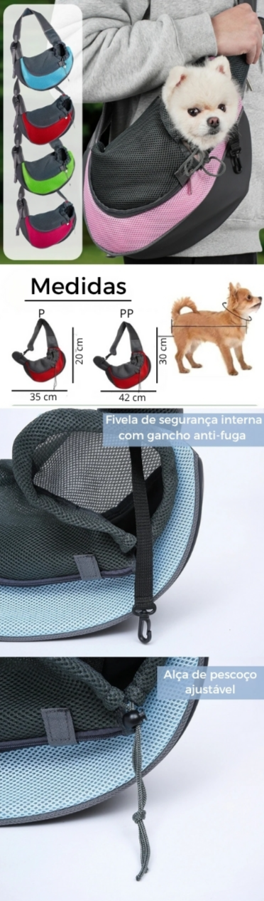 Design ergonômico: estilo “estilingue” que permite manter o pet junto ao corpo, reforçando a sensação de aconchego e segurança.