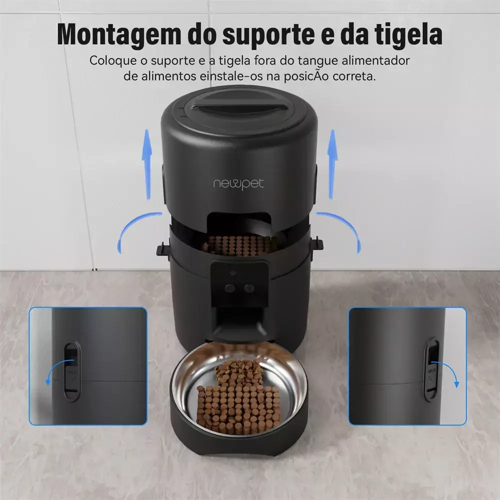 Esse alimentador automático para animais de estimação oferece porções flexíveis de 1 a 40 porções por refeição, cada porção tem cerca de 5g e capacidade do recipiente é de 2L.